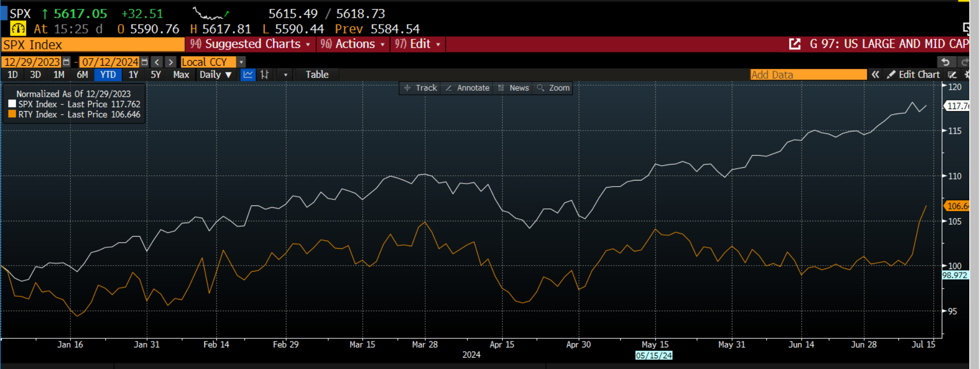 Chart 1: S&P 500 and Russell 2000, the mid-caps play catch up