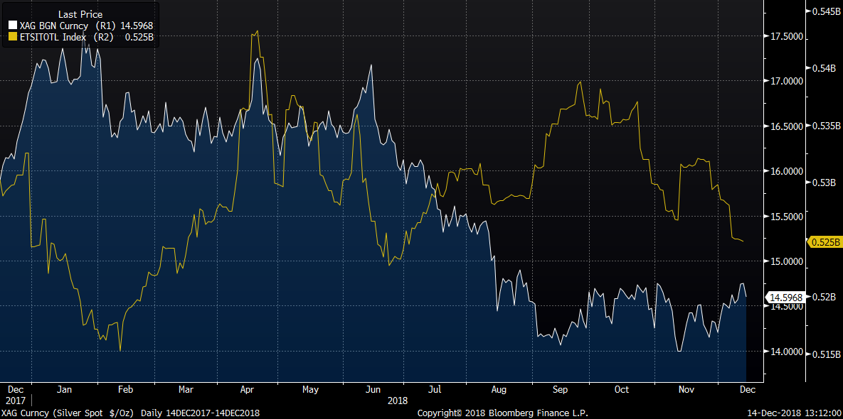 This year has not proved to be successful for investors in the silver market. Solid gains were seen only at the turn of 2007 and 2008 due to a massive retreat in the equity market. Subsequently, range trading began and the price was trading between $16.2 and $17 during the first half of the year. This consolidation moved toward a profound sell-off during the second half of this year. What was the prime cause behind this change? The answer is the strong US dollar and a rally seen in equity markets across the globe. The greenback was supported by higher bond yields as well as the anticipated quicker pace of monetary tightening (4 instead of 3 hikes this year). The last move (the 4th rate increase) could take place this Wednesday. In recent weeks we have seen some signs of a bounce in silver prices but momentum has been weakish so far. The similar scenario has been seen in gold prices. Will silver prices follow gold prices if the latter go up?