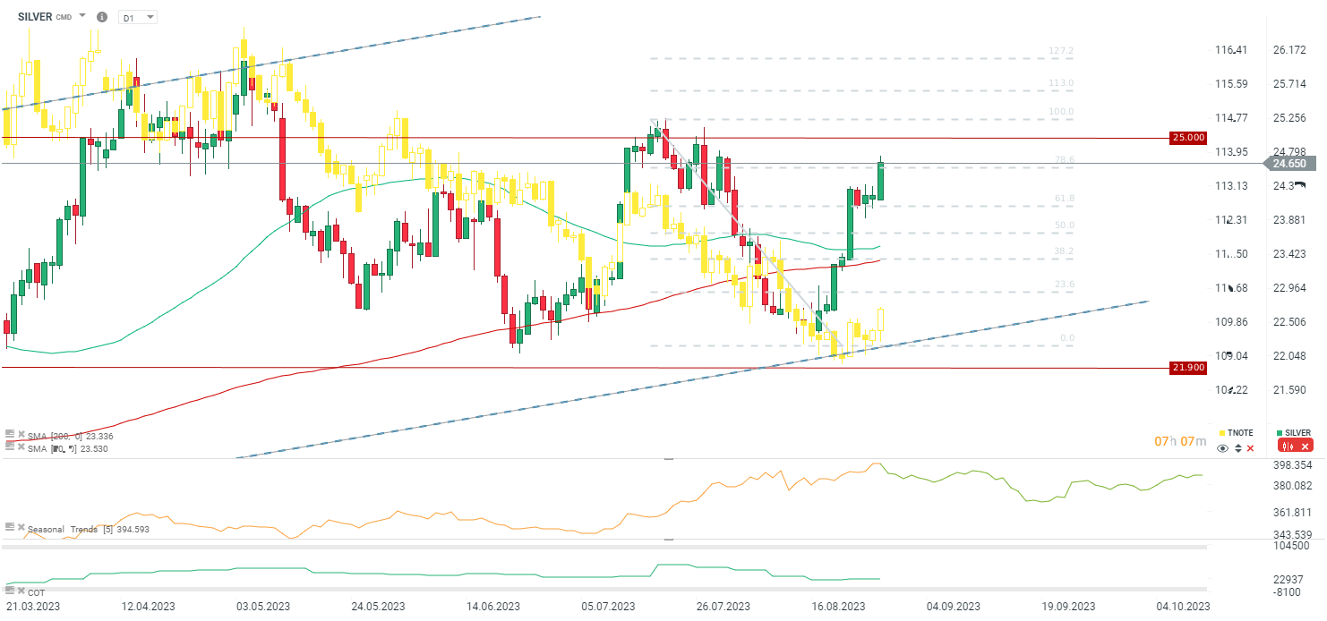 We are observing significant increases in bond prices (TNOTE) following release of US data today, leading to a decrease in yields. The dollar is reacting to this, and EURUSD is now clearly trading above 1.0800. Gold has quickly risen back above $1930 per ounce, while silver is approaching the $25 per ounce mark. Silver experienced a strong upward surge last week and has risen by over 10% from its recent low. The $25 per ounce range is a local peak from mid-July.