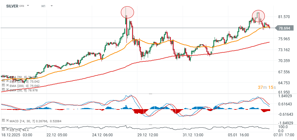 From a technical perspective, the silver chart shows a potential bearish double-top formation around >$80 per ounce, which now appears as the key resistance level. Significant support can be found near the EMA200 on the hourly chart, around $76 per ounce.