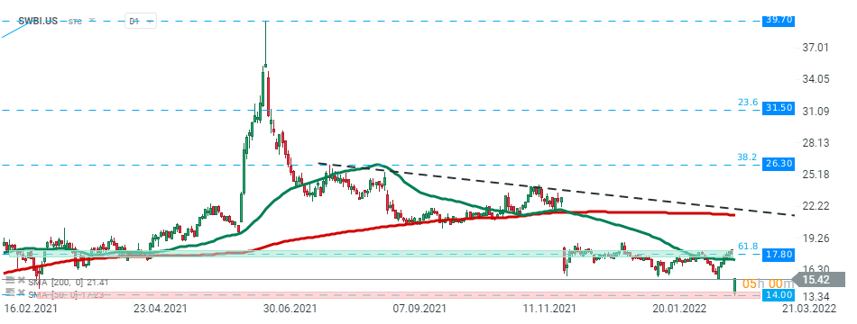 Smith & Wesson (SWBI.US) stock launched today's session with a bearish price gap, however sellers managed to halt declines around $14.00 level and rebound started. The nearest resistance is located at $17.80 and coincides with 61.8% Fibonacci retracement of the upward wave from March 2020. Source: xStation5