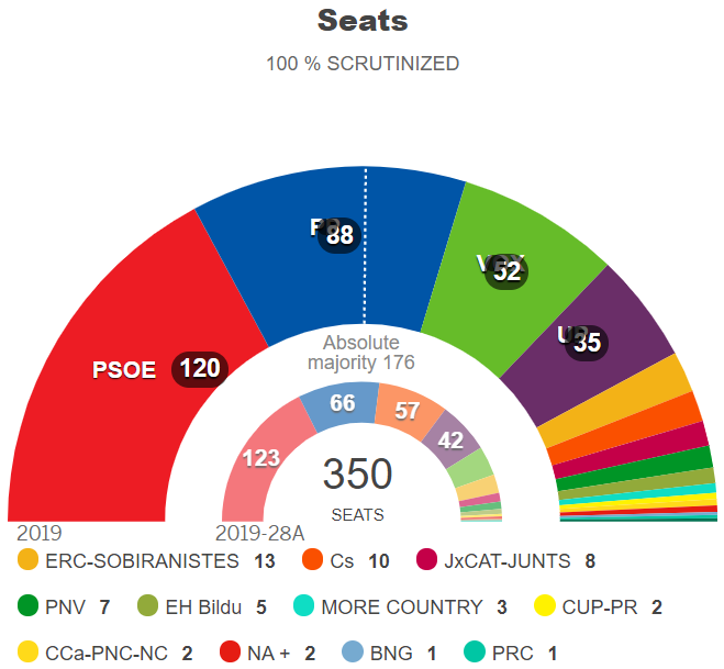 A breakdown of seats in the Spanish parliament compared with seats won by parties in April's elections. Source: El Pais