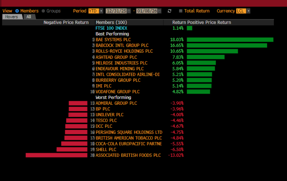 If you want to gauge the market’s view on the geopolitical situation, take a look at the early YTD performance of the FTSE 100 and the Dax. The FTSE100’S top performers are dominated by defense firms. BAE Systems, Babcock International and Rolls Royce are higher by 18%, 17% and 10% respectively. This isn’t bad for the 8th January.