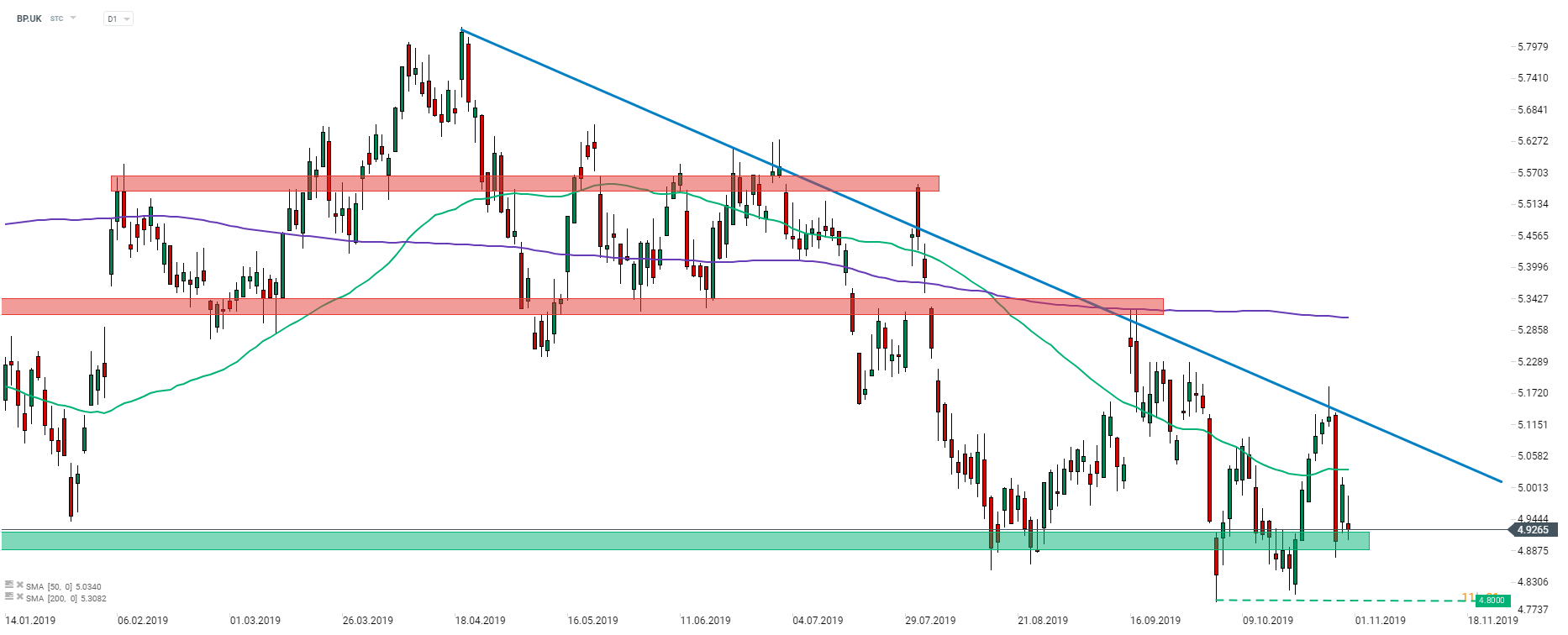 Share price of BP (BP.UK) plunged during earnings call when CFO said that discussion on dividend increase is premature. The company later explained that it simply did not discuss dividend increase, not that it is unlikely to make one. Nevertheless, the share price did not recover from the drop and remains close to the long-term support zone at £4.90. Slightly lower one can find 1.5-year low of £4.80. Source: xStation5
