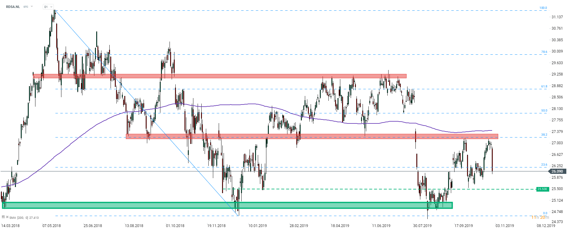Royal Dutch Shell (RDSA.NL) pulled back following the second failed attempt of breaking above the resistance zone at 23.6% Fibo level of the downward move started in May 2018 (€27.20). Decline deepened today after the company warned that weaker outlook for the global economy may put its major buyback programme at risk. Today’s weak performance of crude price is only making things worse. The first support level to watch can be found at the €25.50 handle. Source: xStation5