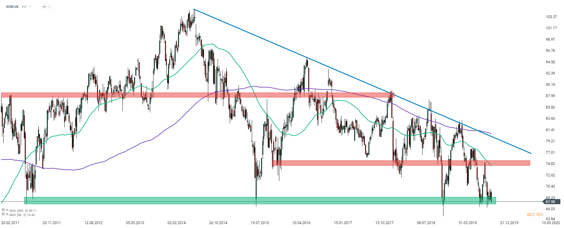 Situation on the Exxon Mobil (XOM.US) chart is similar to the one on the chart of BP. Both stocks trade near key support zone, and both have been in a downtrend for some time already. However, Exxon trades near his zone before the earnings release, and in case its announcement is to be followed by a drop similar to the one European supermajors experienced, it may break to fresh 1-year lows. On the other hand, should Exxon surprise positively, the stock could move higher with 50-week moving average being the first level to watch (green line, $74.60). Source: xStation5