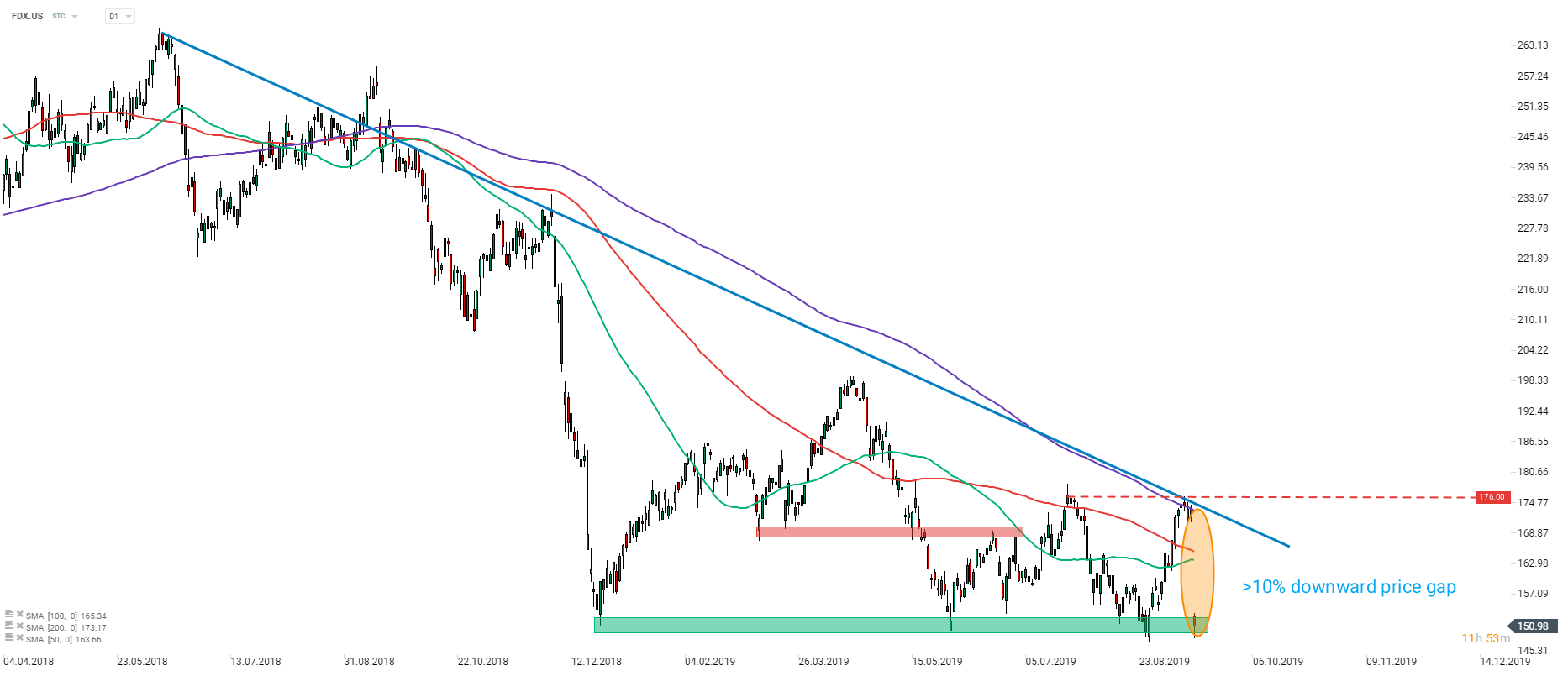 FedEx (FDX.US) shares were trading in a downward move since Sino-US trade tensions began to flare up in the first half of 2018. Lacklustre earnings report caused the stock to open over 10% lower on Wednesday. Note that the stock plummeted from interesting technical area - combination of 200-session moving average, downward sloping trendline and level of the previous peak ($176). Following a slump, price found itself within the support zone ranging above $150 handle and a break below would paint a fresh 3-year low. Source: xStation5