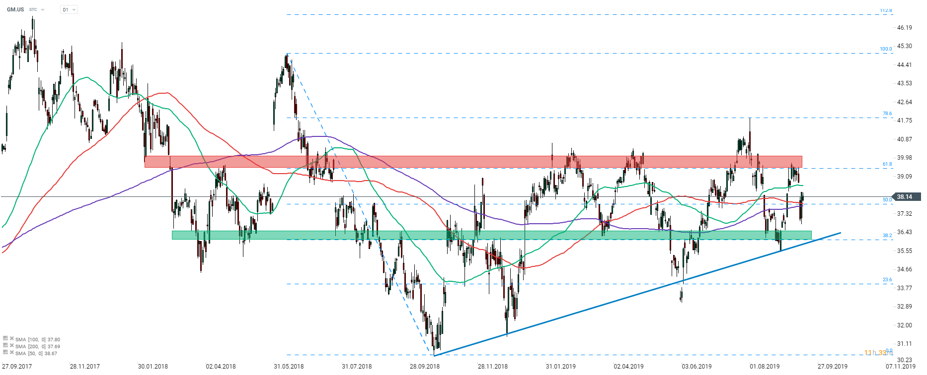 General Motors (GM.US) share price dropped around 5% on Monday after breakdown in negotiations between the company's management and workers union triggered a strike. Talks were restarted and stock managed to recover. However, unless the strike ends, any bigger upward price move looks questionable given how much the company is losing on halted operations. Source: xStation5