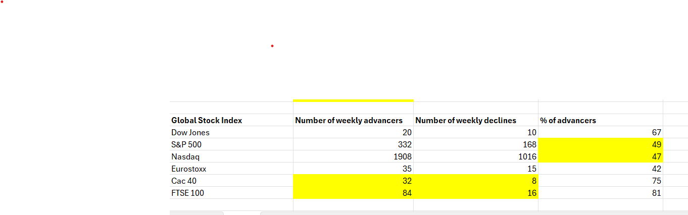 As you can see, the % of weekly advancers is greatest for the FTSE 100, the CAC 40 and the Dow Jones. These are indices that don’t have much tech in them. This signals that investors favoured stocks beyond tech last week, could this be the start of a broader rally for US and European stocks? European stocks also performed better on a weekly basis that their US counterparts. While one week of data does not make a trend, we are at an interesting moment in the current cycle for stock markets. Could this be a sign that the market might start favouring cheaper European stocks over their US counterparts?