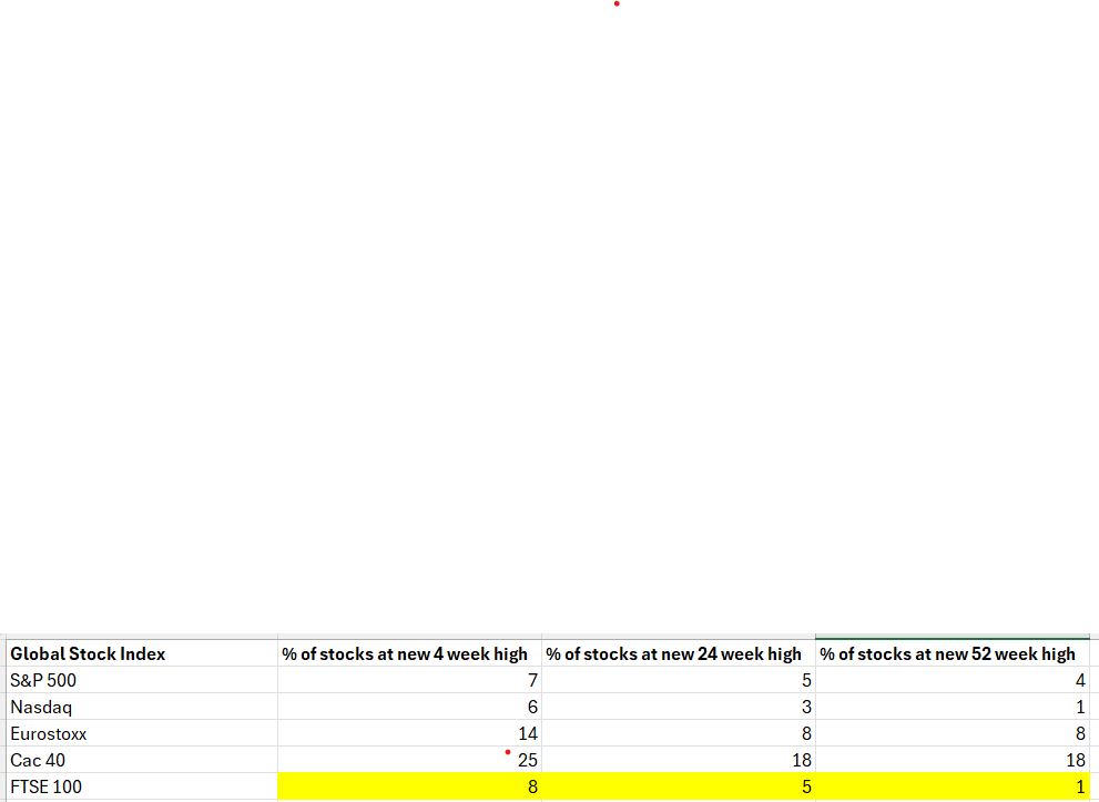 The % of new weekly highs indicator is useful, since it can show us market breadth, positive market breadth can indicate a bull market, while negative market breadth can be a sign of a bear market or a cheap market. As you can see, apart from the Cac, overall these numbers are low, which suggests two things. Firstly, that the market breadth in the US markets is low, and the rally in the index is driven by only a small number of stocks. We have spoken about this before, and the tech sector is driving US indices. For the UK, where the % of stocks making 4,24 and 52 week highs is also low, it signifies something different from the US: an unloved index that is fairly cheap. Stocks can be cheap for a reason, and for most of the last year the market has not favoured UK stocks. This week’s strong performance could change things, and we will be watching to see if the FTSE 100 can extend these gains.