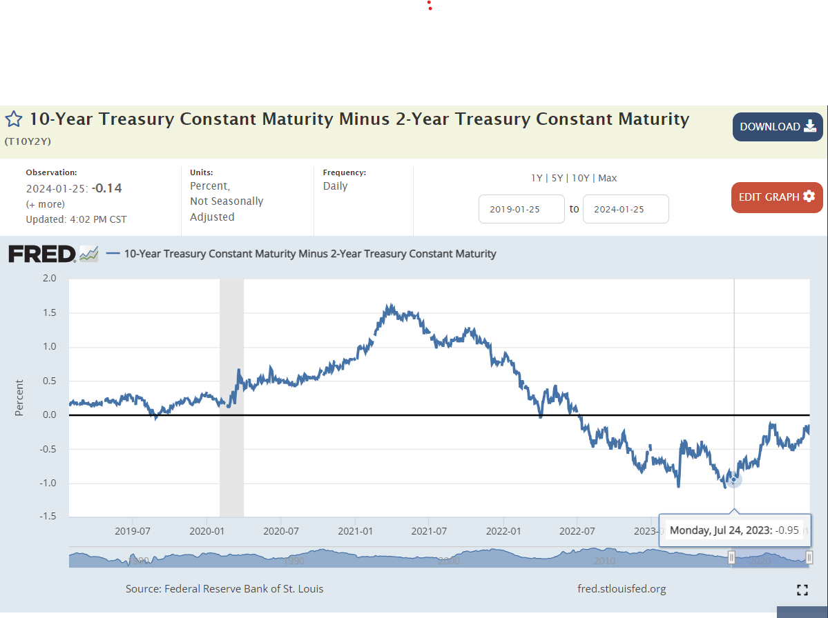 The US yield curve looks at the difference between 10-year US Treasury yields – 2-year US yields. The difference is the yield curve and it is a recession indicator. It is not a particularly accurate recession indicator, as you will see. It has been inverted since July 2022. When the yield curve inverts, it can be a warning sign that a recession is on the horizon. Not only has the US avoided a recession, but it’s economy had experienced strong growth, particualy in the second half of 2023. However, this is still an indicator that is worth watching, especially when it looks like it is changing direction. Since the start of the year, this indedx has been steepening – when 10-year yields are rising faster than 2 -year yields, as expectations rose that the Fed would cut interest rates. However, in recent days, the curve has flattened, which could be a sign that the bond market thinks rate cuts are less likely. This hasn’t fed into interest rate expectations, the market may be pricing out the chance of a rate cut in March, but there are still 6 rate cuts expected in the US this year.