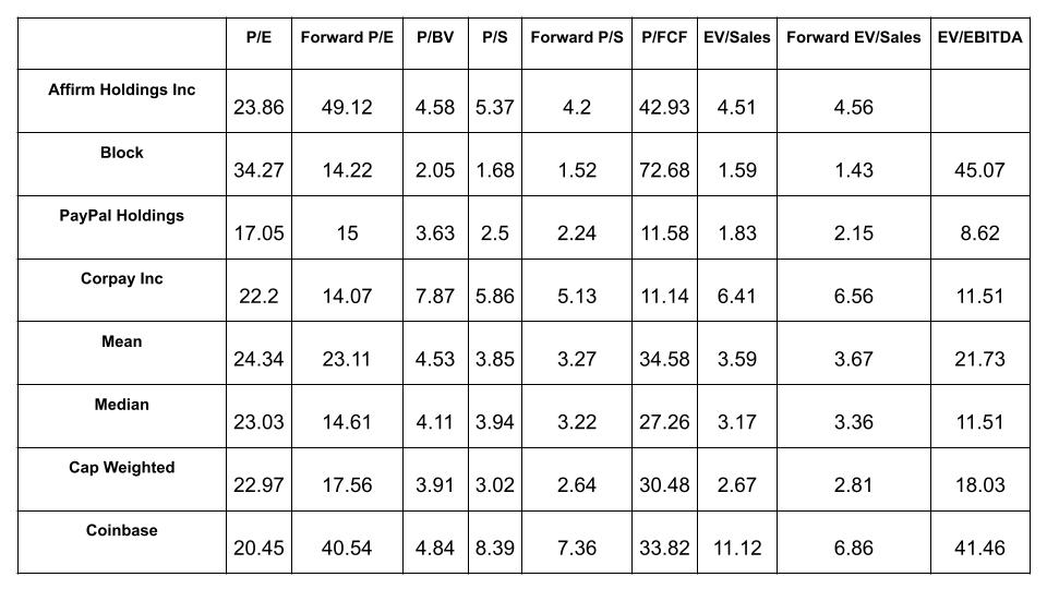 Next, let's take a look at how Coinbase compares with peers. We have constructed a peer group consisting of 4 companies, whose business model might be similar to Coinbase: Block, Paypal, Affirm and Corpay. As can be seen Coinbase is above the mean for the peers in almost every aspect.