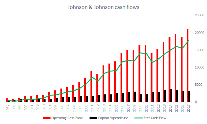 Johnson & Johnson enjoyed strong and rising operating cash flow during the past three decades. The company was quick to recover from any pullbacks in operations. Source: Bloomberg, XTB Research