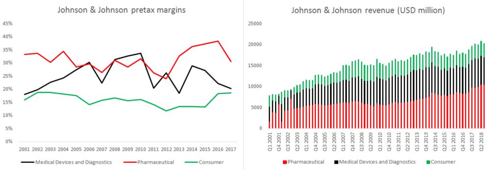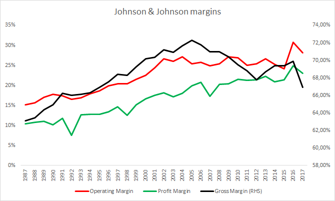 Returning to margins’ topic, let’s take a look at figures for the whole company. As one can see on the chart above Johnson’s gross profit margin moved lower during the past year. According to company’s 2017 annual report the reason behind the drop were higher marketing and research expenses as well as higher amortization expenses (mostly related to acquisition of Swiss biotech company, Actelion). An interesting feature visible on the chart is that while company’s gross margin dropped during financial crisis, its operating and profit margins actually increased. Last but not least, while the chart may at first glance show a significant drop in the gross margin figures since peak in 2005 it should be noted that during the past three decades it held relatively steady in the 63-73% range. In the whole period depicted on the chart (1987-2017) operating and profit margins kept rising with the latter more than doubling