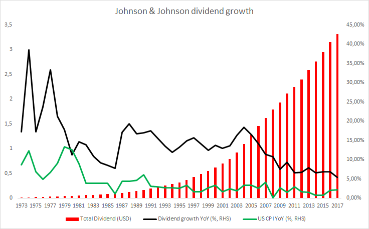 Johnson & Johnson seems to be a good addition to portfolios of investors with a longer time horizon. The company is known for its steady dividend policy as it did not missed a single dividend payout since 1973 and managed to pay higher dividend per share in each consecutive year in the period. Moreover, when we take a look at the chart above we can see that those increases were not just nominal ones. The company’s rate of dividend growth was constantly above the US CPI inflation with year 1980 being the only exception (dividend growth - 11.27%, CPI - 12.5%). Additionally, company’s stock looks more resistant to periods of economic downturn than a broad market. Taking a look at weekly rates of return between peak of dot-com bubble and subsequent trough in late 2002 one could see that average weekly return for S&P 500 index in that period was -0.55% with a standard deviation of 2.86%. When it comes to Johnson & Johnson the mean weekly return was 0.26% with a standard deviation of 3.85%. However, one may argue that dot-com bubble was not about pharmaceutical companies. Then let’s take a look at figures for financial crisis of 2007-2009 that was marked with even broader declines. Taking peak of the bubble in late-2007 as starting point and trough in early-2009 as ending point results also point to superior performance of Johnson & Johnson. While S&P 500 index had a mean weekly return of -1.03% with a standard deviation of 4.36%, the company had mean return of -0.38% with a standard deviation of 3.35%. As one can see, rates of return from investment in Johnson & Johnson stock in the period of financial crisis were not only higher but also less volatile. To complement the analysis it should be said that smaller volatility is seen mostly at times of financial turmoil. Analyzing weekly rates of return since the turn of millenia (2000 - present) one can see that S&P 500 had a mean weekly return of 0.09% with 2.4% standard deviation while Johnson & Johnson had mean return of 0.15% with a standard deviation of 2.55%. In the same period correlation coefficient between the two turned out to be 0.48 pointing to moderate correlation and potential benefits from diversification.