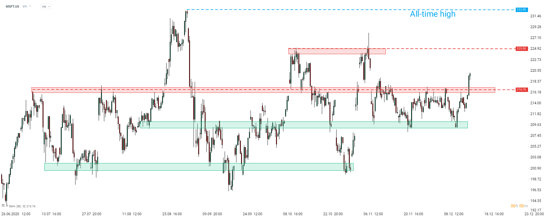 Microsoft (MSFT.US) has been trading in a more or less sideways move since summer. However, the stock has managed to break above the resistance zone range around $216.75 yesterday. The nearest resistance to watch is marked by a double top at $225 and is the final hurdle blocking the way towards all-time high at $232.85. Source: xStation5