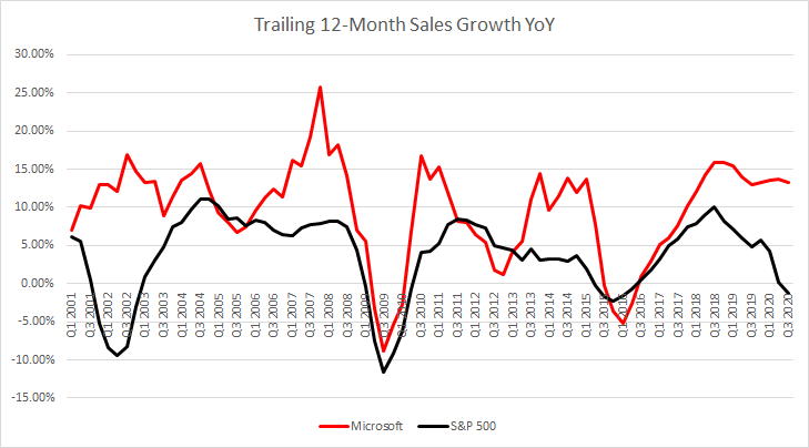 Microsoft has been trading in a strong upward move since the global financial crisis. Share price increased from around $15 in early-2009 to over $200 now. Steep gains were made on the back of solid fundamentals with Microsoft beating the S&P 500 index in terms of sales growth on a regular basis. The company has also beat the index in terms of earnings growth for the past few years. However, executives recognized that a new business model may be needed to maintain a solid pace of growth and decided to focus on increasing share of recurring revenue and scaling back reliance on hardware sales.