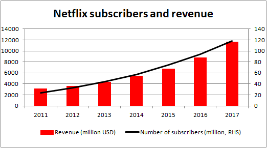Netflix enjoyed a stable and rapid growth of both revenue and number of subscribers. Source: Bloomberg, Statista