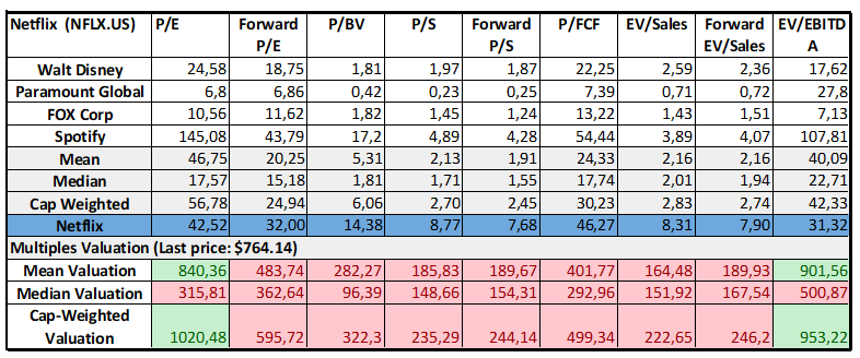 Next, let's take a look at how Netflix compares with peers. We have constructed a peer group consisting of 4 companies, whose business model might be similar to Netflix: Walt Disney, Paramount Global, Fox Corp and Spotify. As can be seen Netflix is above the mean for the peers in every aspect. We have calculated Netflix mean, median as well as cap-weighted multiples for the peer group. Three different Netflix valuations for each of those multiples were later calculated. As one can see in the table below, the vast majority of those suggest that Netflix shares are overvalued at current prices, with some valuation metrics being disturbed by high Spotify data. However Spotify's business model is similar to Netflix.