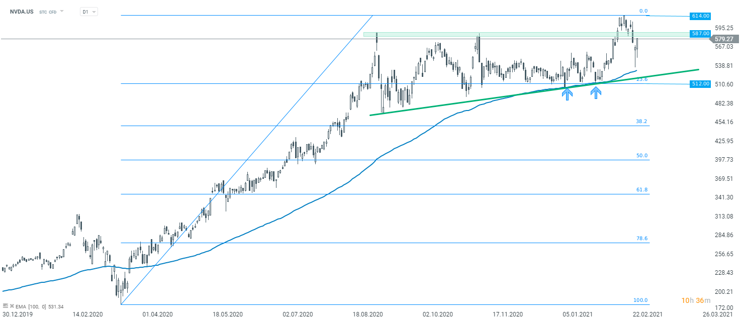 Nvidia (NVDA.US) has been trading sideways in the final quarter of 2020 and at the beginning of 2021. However, stock bounced off the lower limit of the range at $512 in January and rallied above $600 for the first time in history. Part of this gain has been erased already and stock dropped below price zone at $587. In case pullback deepens, the first support to watch can be found at 50-session EMA. Source: xStation5