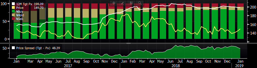 Recommendation data compiled by Bloomberg shows that analysts remain optimistic about Volkswagen. Over 80% of analysts recommends buying German car maker while just 9.7% suggest selling the stock. Average 12-month price target is €198.09, implying over 30% increase against market price. Source: Bloomberg