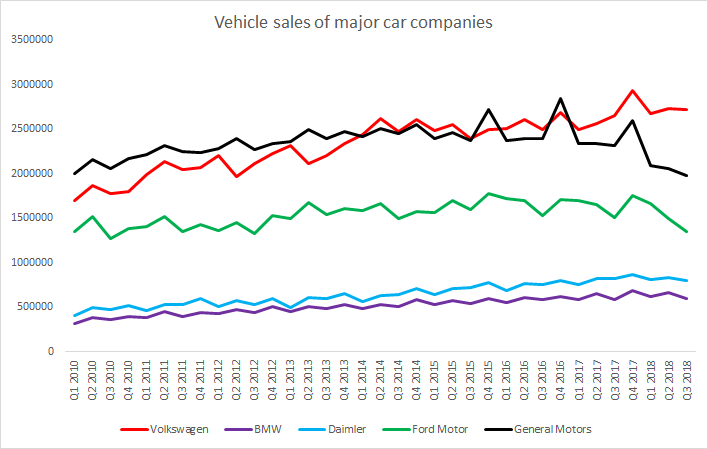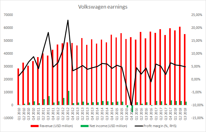 Volkswagen (VOW.DE) was in the center of one of the biggest corporate scandals earlier this decade. So-called “Dieselgate” affair surfaced in 2015 when the US Environmental Protection Agency raised concerns over the amount of toxic fumes emitted by Volkswagen cars. Automobile company initially rejected any accusations but admitted later on that software in its vehicles was programmed to cheat emission tests. News that as much as 11 million cars may be affected by illegal software triggered a wave of lawsuits causing Volkswagen to pay at least €27 billion in case-related costs up to date. However, the amount of money Volkswagen is obliged to pay to settle charges is diminishing each year. Right now it is expected that the company will have to pay additional €2 billion in 2019 and €1 billion in 2020. While no further expenses related to “Dieselgate” are expected it does not mean that things are as plain as they were pre-2015. Volkswagen’s image was severely damaged and looming global slowdown is denting enthusiasm in the automobile industry.