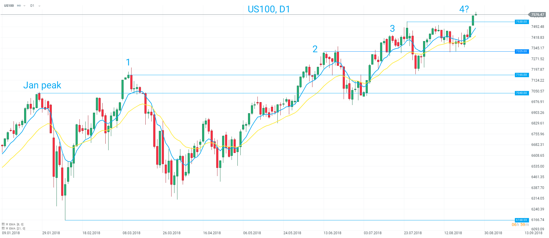 The US100 has taken out its prior peak on 4 occasions since the January high now. However, the past 3 breaks higher have only seen limited gains before falling back lower. Source: xStation