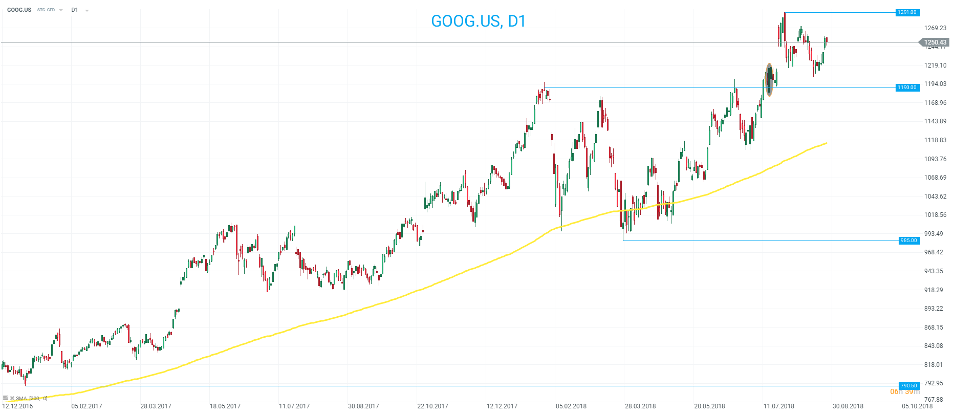 Google shares have dipped a little lower today but they remain in a broader uptrend with price clearly above the 200 day SMA. The all-time high at 1291 is somewhere to look to above as possible resistance while the breakout level at 1190 has since acted as support on dips lower. Source: xStation