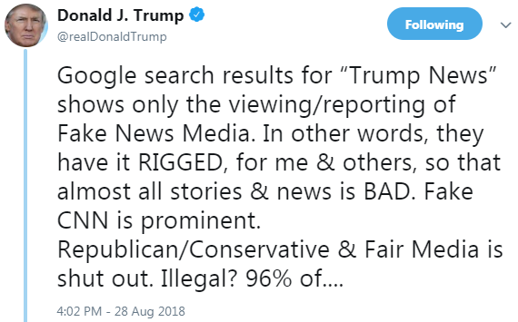 Trump took aim at Google in an earlier message on social media. The stock has seen some mild selling off the open in reaction. Source: Twitter