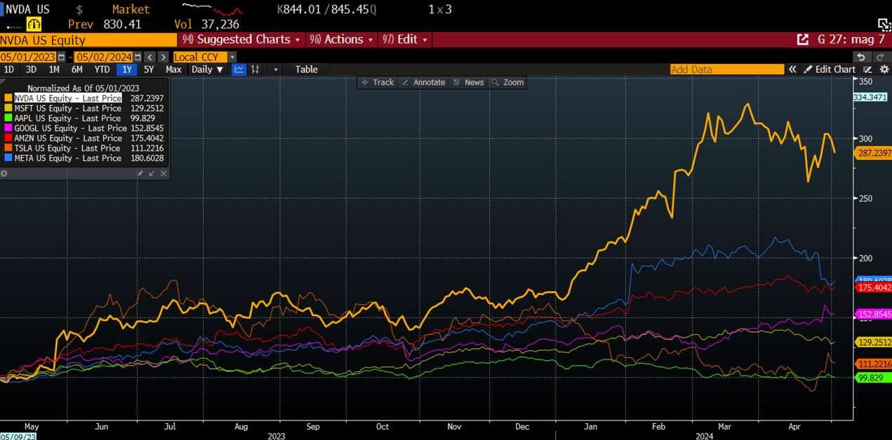 The market will want to know how Apple’s top brass are dealing with the slowdown in China, and how iPhone sales are doing, after reports that it is also losing market share globally. Sales of Vision Pro, which went on sale in February, will also be closely watched to see if it can either make up for the shortfall in iPhone sales, or if it flops. Investors also want to get an update on Apple’s AI strategy. It is unique in the Magnificent 7 in that it has not pursued a strategy to develop AI in house, instead it has looked to tie ups, for example with Google, to implement into its products. The market will want an update on this passive AI strategy and whether it is paying off. On the plus side, Apple is unlikely to report the massive capex spend on AI that sent Meta’s shares plunging last week.