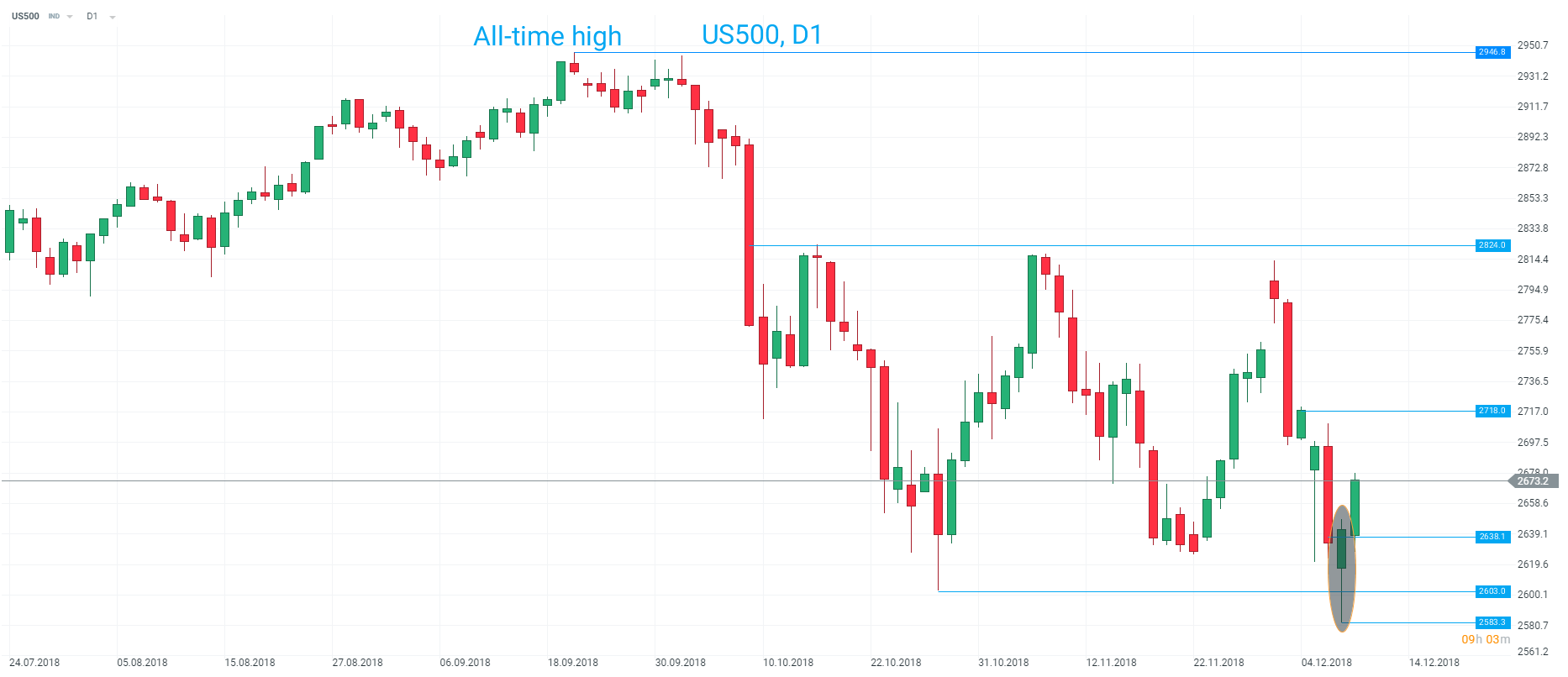The sentiment around stock markets seems to have improved markedly in the last 24 hours after an attempted break lower yesterday was met with a fairly strong rebuttal. The US500 took out the October low of 2603 as things looked set to go from bad to worse, but buyers stepped in aggressively and managed to end with a green daily candle. This false break accompanied with a bullish hammer is a clear positive development and while it would be premature to declare that we are out of the woods just yet, the mood is decidedly more upbeat.