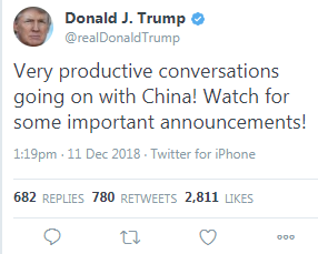 Trump’s tweet strongly hints at positive developments on the trade front with China and has boosted stocks to their highest level of the week. Source: Twitter