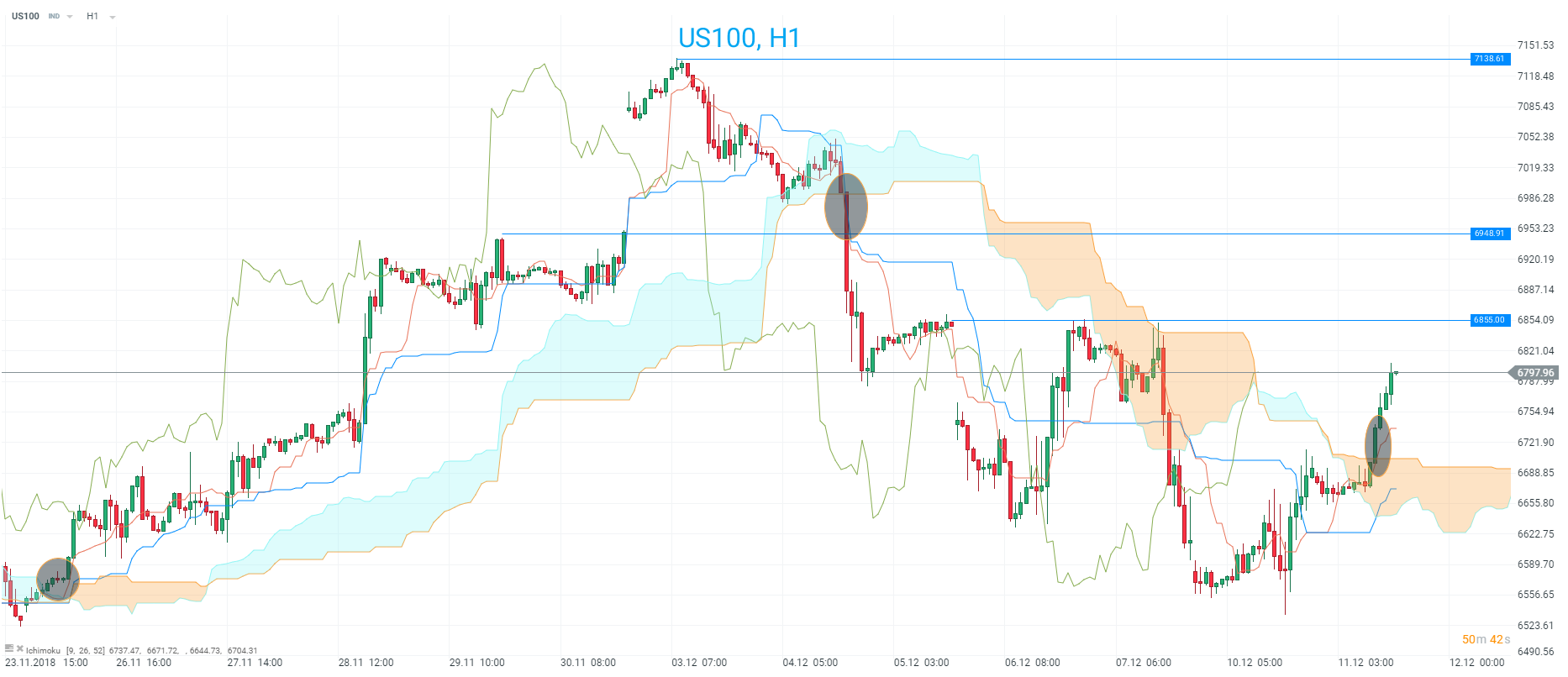 The US100 has enjoyed a strong push higher today and in doing so moved above the H1 cloud. Price is not far from receiving confirmation from the accompanying lines and the past 2 occasions this has happened led to sustained moves in that direction. Source: xStation