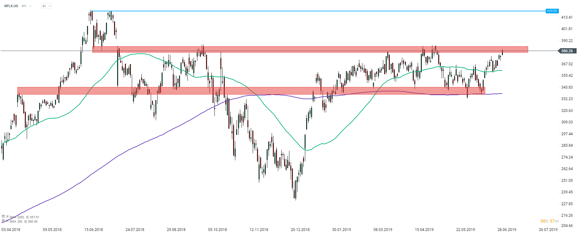 Netflix (NFLX.US) share price is storming the upper limit of the consolidation range that limited stock’s moves this year. This is the last hurdle preventing the stock from retesting ATH at $420 and a break higher could paint a bullish technical signal. However, Netflix traders should keep on guard on 17 July as the company is set to release earnings report for Q2 2019. Source: xStation5