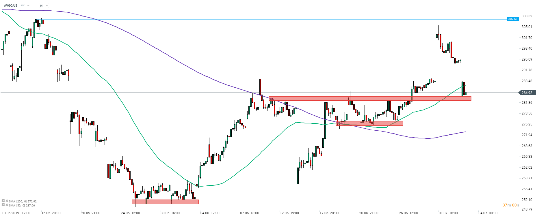 Following higher opening on Monday, Broadcom (AVGO.US) failed to rally further. The company was boosted by US-China trade truce but upbeat sentiment towards the semiconductor companies failed to extend into the later part of the week. The stock plunged at today’s opening and is trading close to the support zone that limited upward moves throughout the major part of June. Break lower could risk declines deepening towards the 200-hour moving average (purple line). Source: xStation5