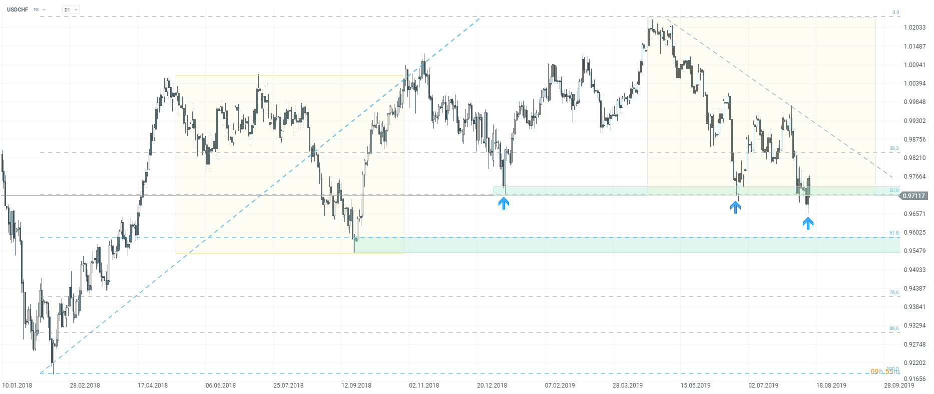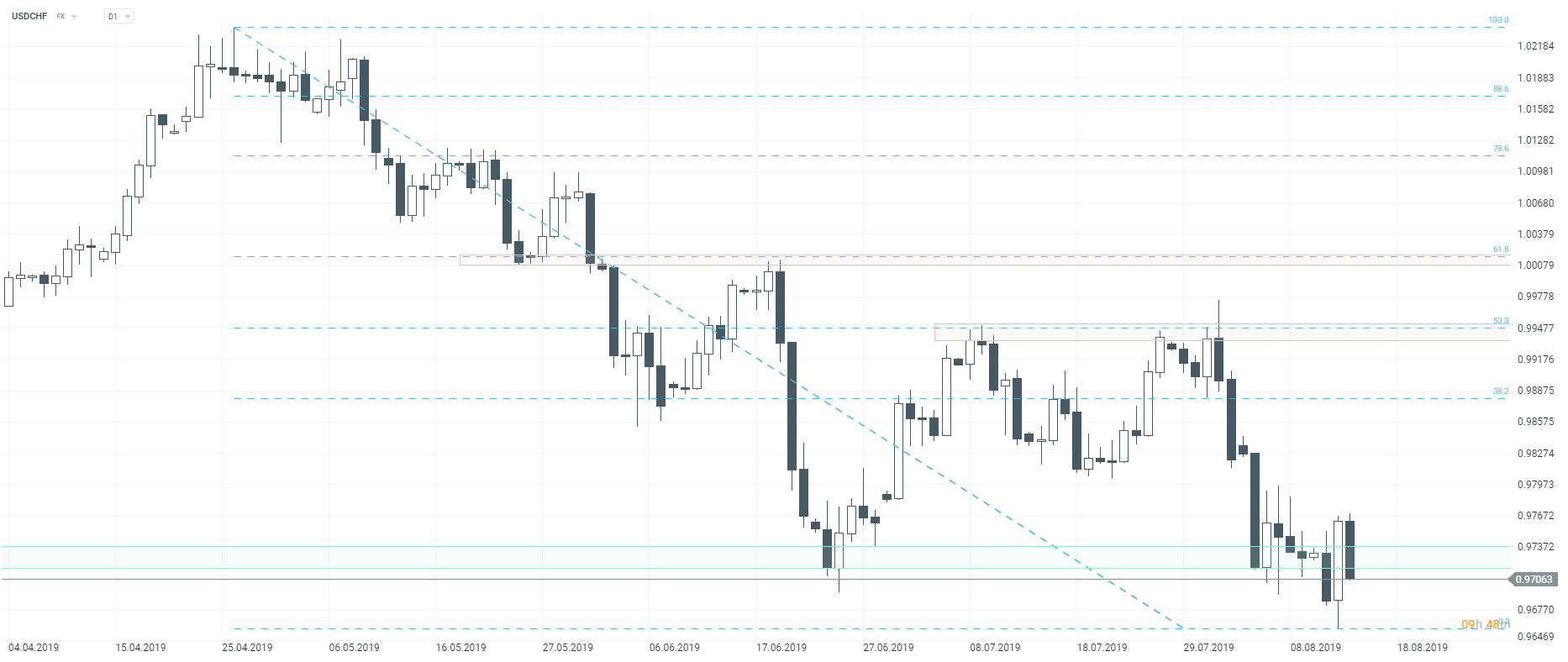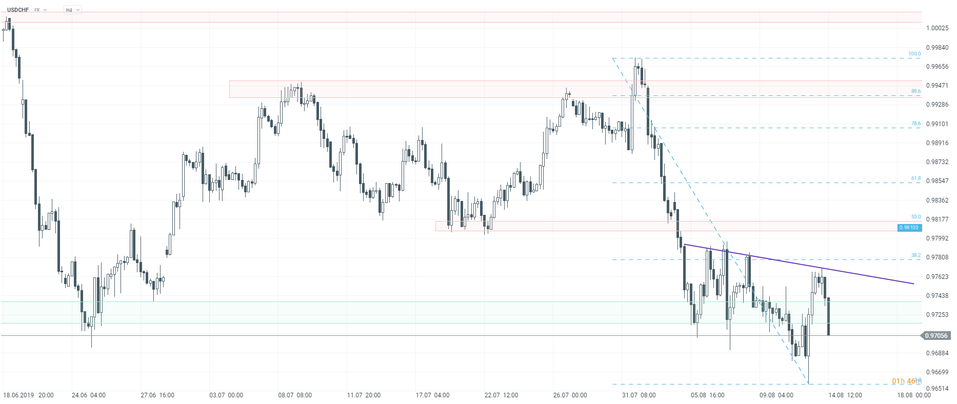 Let's start the analysis with D1 interval. The USDCHF currency pair once again reached the support zone marked with the Overbalance structure and the lows from 10 January 2019. The demand side reacted to this area at the end of June, but the market did not manage to reverse back to the upward trend. The price reversed slightly below the round level of 1,0000 and the pair started to decline again. Now the pair is testing the zone at 0.9720. This is another test over the past two months and each subsequent attempt will increase the likelihood of breaking lower. In such a scenario, downward movement could extend. There are around 150 pips to the next important support level that is marked with lows from September 2018 and the 61.8% Fibo level of the whole upward wave started in February 2018.