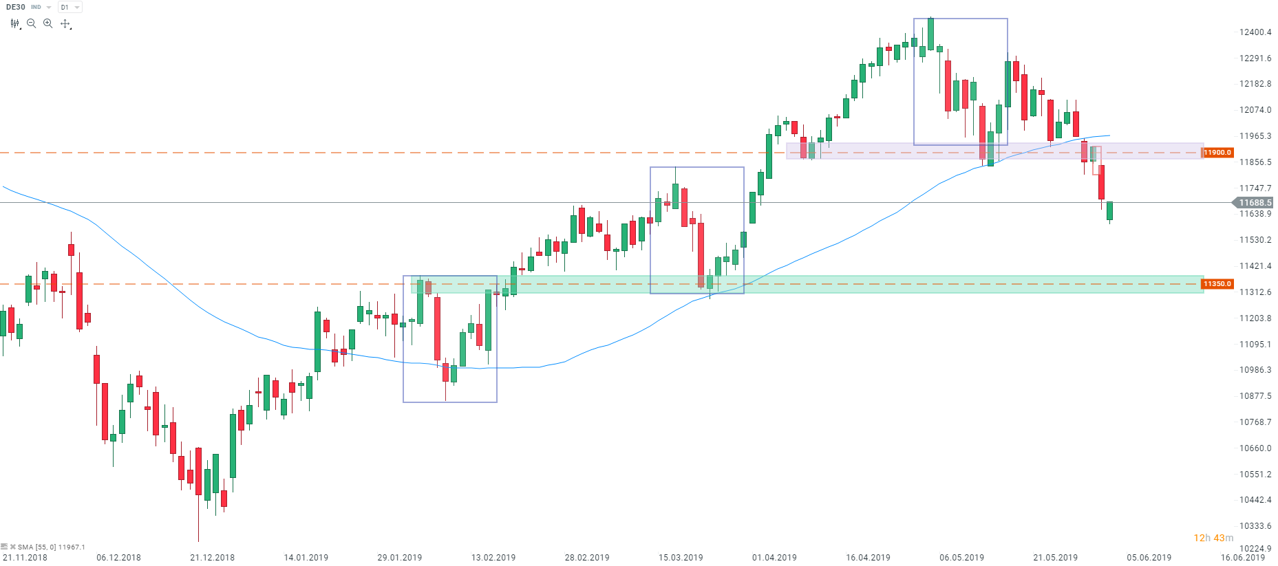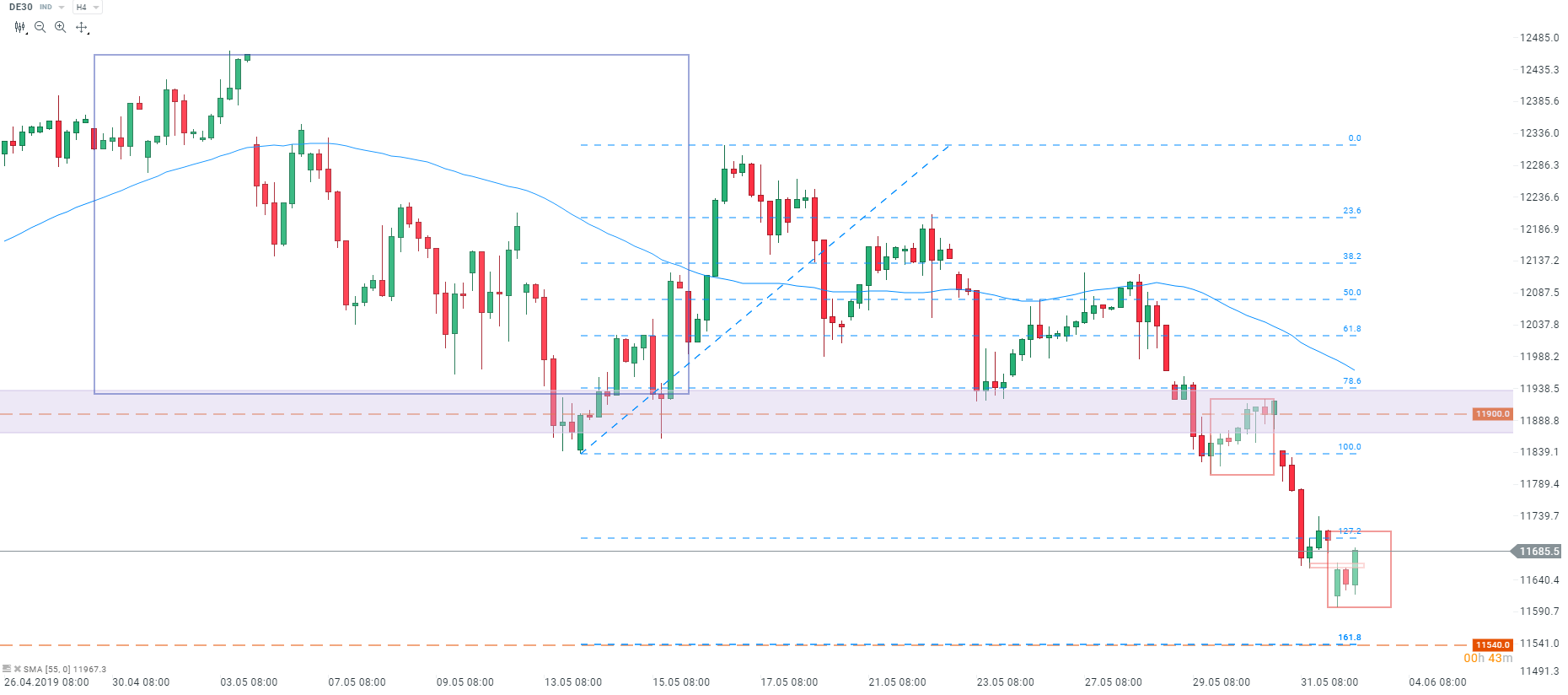 Taking a look at the lower frame - H4 - we can see that downward move accelerated after breaking below the support level near the 11900 pts handle and as long as the price remains below this hurdle, the outlook favors bears. Of course, it is possible that buyers will try to “close” today’s downward gap but overall trend hints at a move lower therefore any long positions are subject to a bigger risk now. Over the course of the upcoming days we may witness extension of a downward move towards the 161.8% Fibo level of the upward move from 14-17 May.