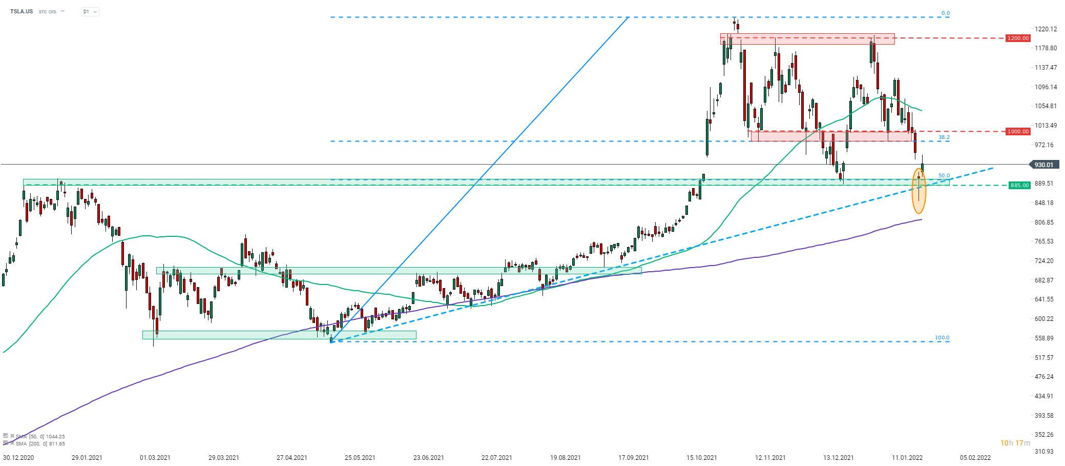 Taking a look at the Tesla chart (TSLA.US) at the D1 interval, we can see that stock took a hit during the recent stock market sell-off. Share price dropped to the $885.00 area, where previous price reactions and the upward trendline can be found. Area was defended by bulls and a bullish candlestick pattern was painted in the zone (orange circle). A recovery move was launched yesterday and stock climbed back above $900.00 handle. The nearest resistance zone to watch can be found ranging between 38.2% retracement of the upward impulse launched in May 2021 and $1,000.00 handle.