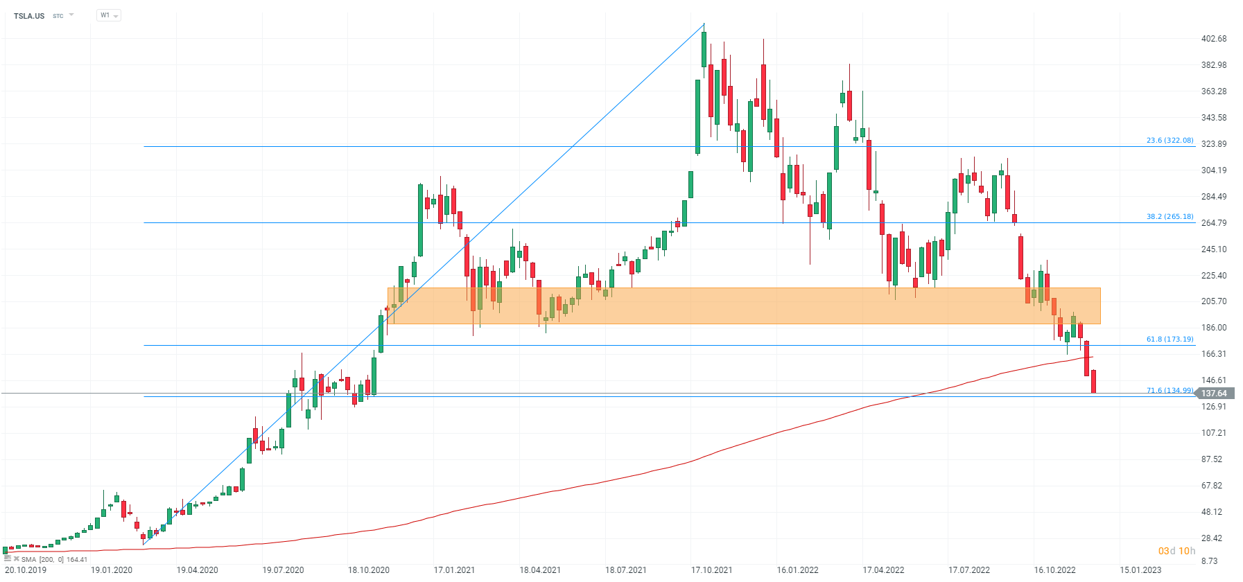 Looking at the company's new factories and very successful financial results for the third quarter of 2022, it is possible that Tesla will maintain its competitive advantage in the long term, while new tax credits for electric vehicles in the US may accelerate demand in the country. The Chinese consumer looks a little worse, who is struggling with much bigger problems this year, which may also be one of the reasons for Tesla's strong sales campaign in the world's second largest economy. According to Joshua White, formerly an economist working at the Securities and Exchange Commission, high interest rates are only partially responsible for the recent sell-off, perhaps the most important component of which is Twitter and the related change in the perception of Elon Musk as CEO, who begins to neglect the company and gets rid of her shares. Tesla's share price has fallen over 65% since the beginning of the year and its capitalization is now lower than ExxonMobil, while at the peak of the 2021 bull market Tesla capitalization was several times higher than the oil giant. This makes the shares of Elon Musk's company one of the 'biggest losers' this year, next to Mark Zuckerberg and his company Meta Platforms, which was hit by the slowdown in the advertising market and the growing controversy among market regulators. Next year could be at least as difficult for the company as 2022, and Wall Street could be forced to significantly lower its expectations.