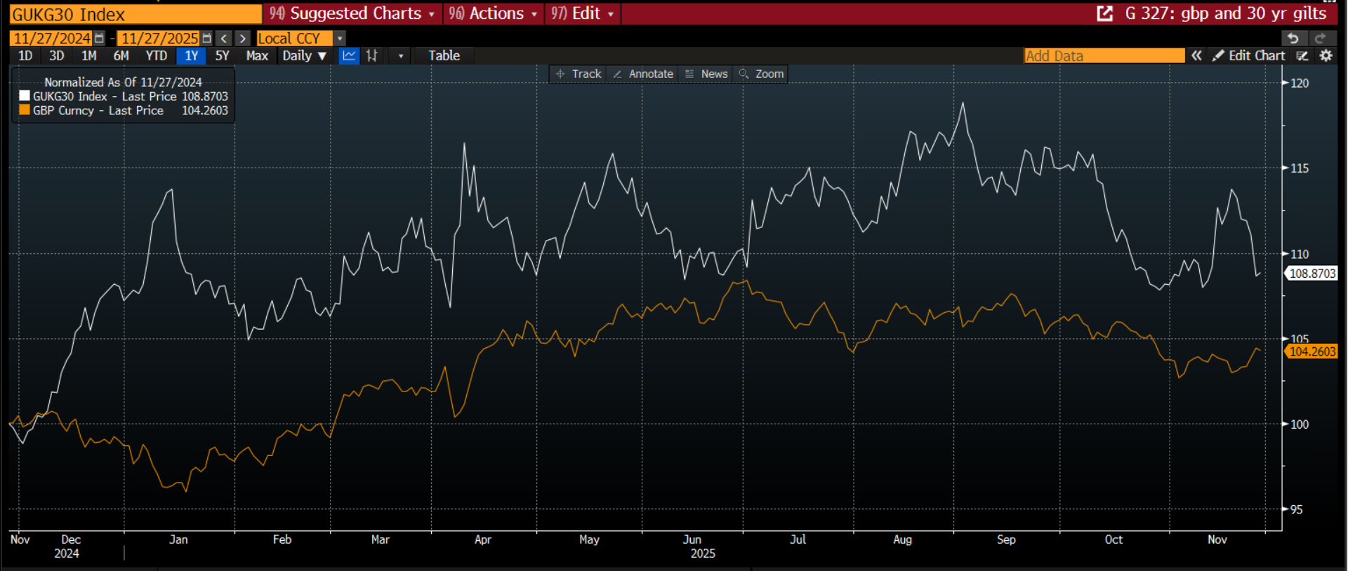 Overall, the bond market gave a nod of approval to Rachel Reeves’ budget on Wednesday. The £22bn fiscal buffer is enough to placate bond markets who are willing to look through increased borrowing in the coming years compared to the OBR’s last estimate. The fiscal risk premium is being eroded from UK yields, even if Gilts are underperforming today. The 30-year UK yield is approaching the 5.2% level, as the pre-budget angst that pushed up yields in recent weeks reverses course. However, UK long end Gilt yields are still more than 50bps higher than they were a year ago. If the fiscal risk premium is lower after this budget due to a bigger fiscal buffer and the relative political stability compared to the last few months, then we should see UK Gilts continue to outperform and yields continue to fall.