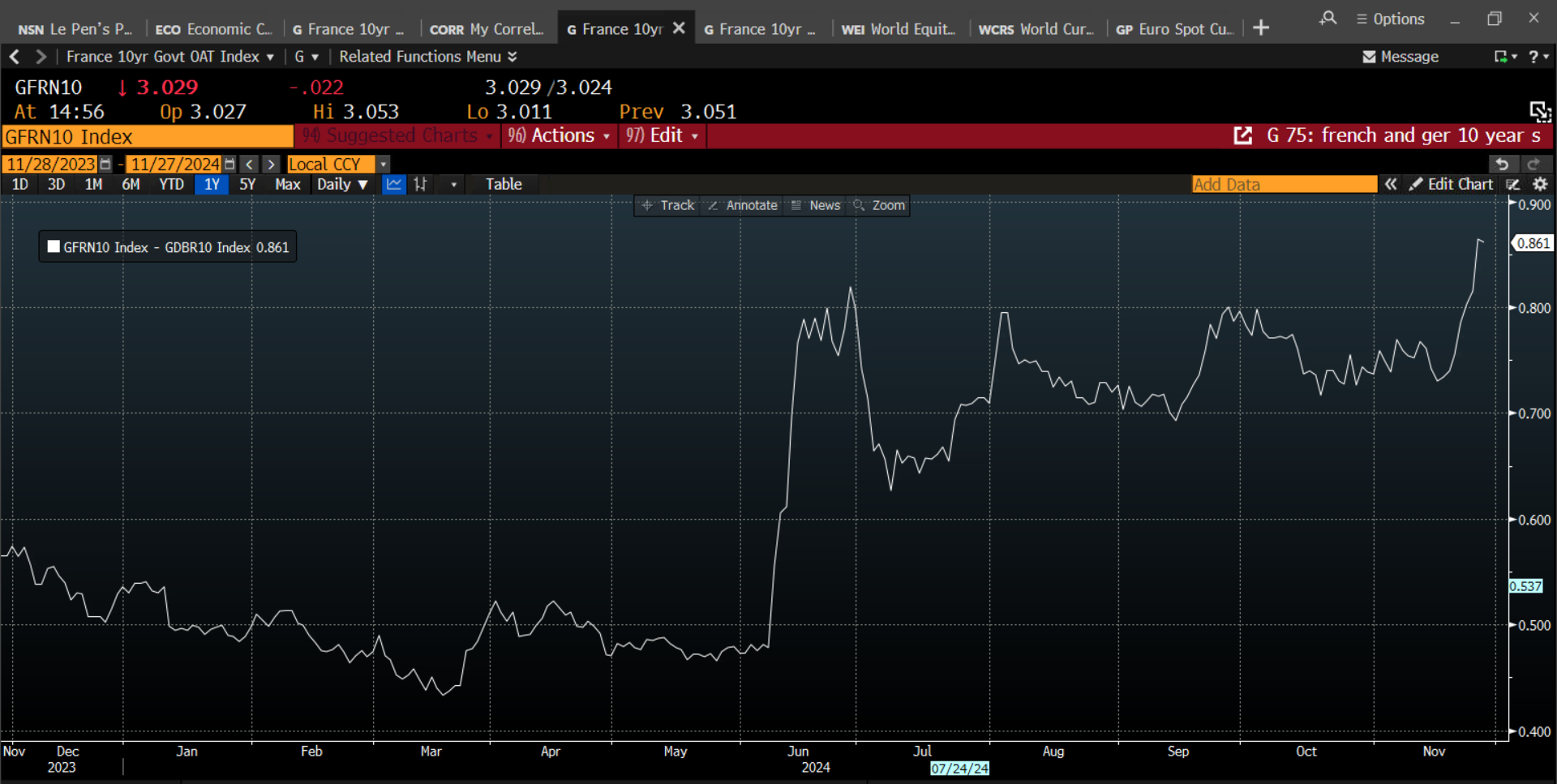 The French parliament has been debating the government’s Budget proposal for weeks. It contains EUR 40bn of spending cuts and EUR 20bn of tax rises, which, as expected, are unpopular. There is now a no-confidence motion being tabled to overthrow the government in the wake of the Budget debates. Whether or not Barnier will remain as PM depends on the Far-Right National Rally, led by Marine Le Pen. She is no fan of President Macron and has campaigned on a platform of change. Thus, Barnier cannot depend on her support if there is a no confidence vote, and Le Pen has not indicated how she would vote.