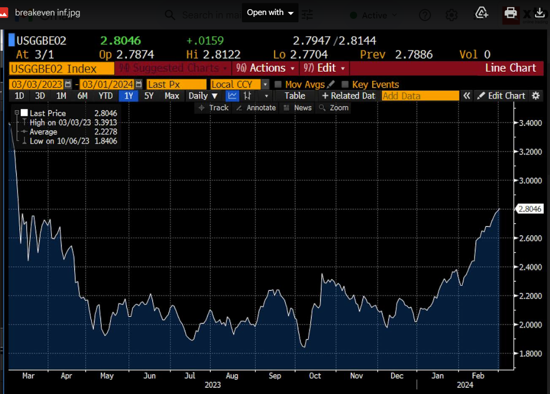 In the US, the focus will be the second half of the week. Jerome Powell will deliver the semi-annual Humphrey Hawkins testimony on March 6th and 7th to the US Congress. He is likely to reiterate his message that the Fed can be patient when it comes to rate cuts, especially after a growing number of signs that inflation pressures could be growing. There has been a big increase in the 2-year breakeven inflation rate, as you can see below, which is at its highest level for a year, and the 1-year inflation expectations from the University of Michigan remain stuck around the 3% level, which supports a cautious approach from the Fed chair this week. Members of Congress are likely to press the Fed chair on cutting rates, but we expect him to remain firm in his message that the timing of the first Fed rate cut will be data dependent.