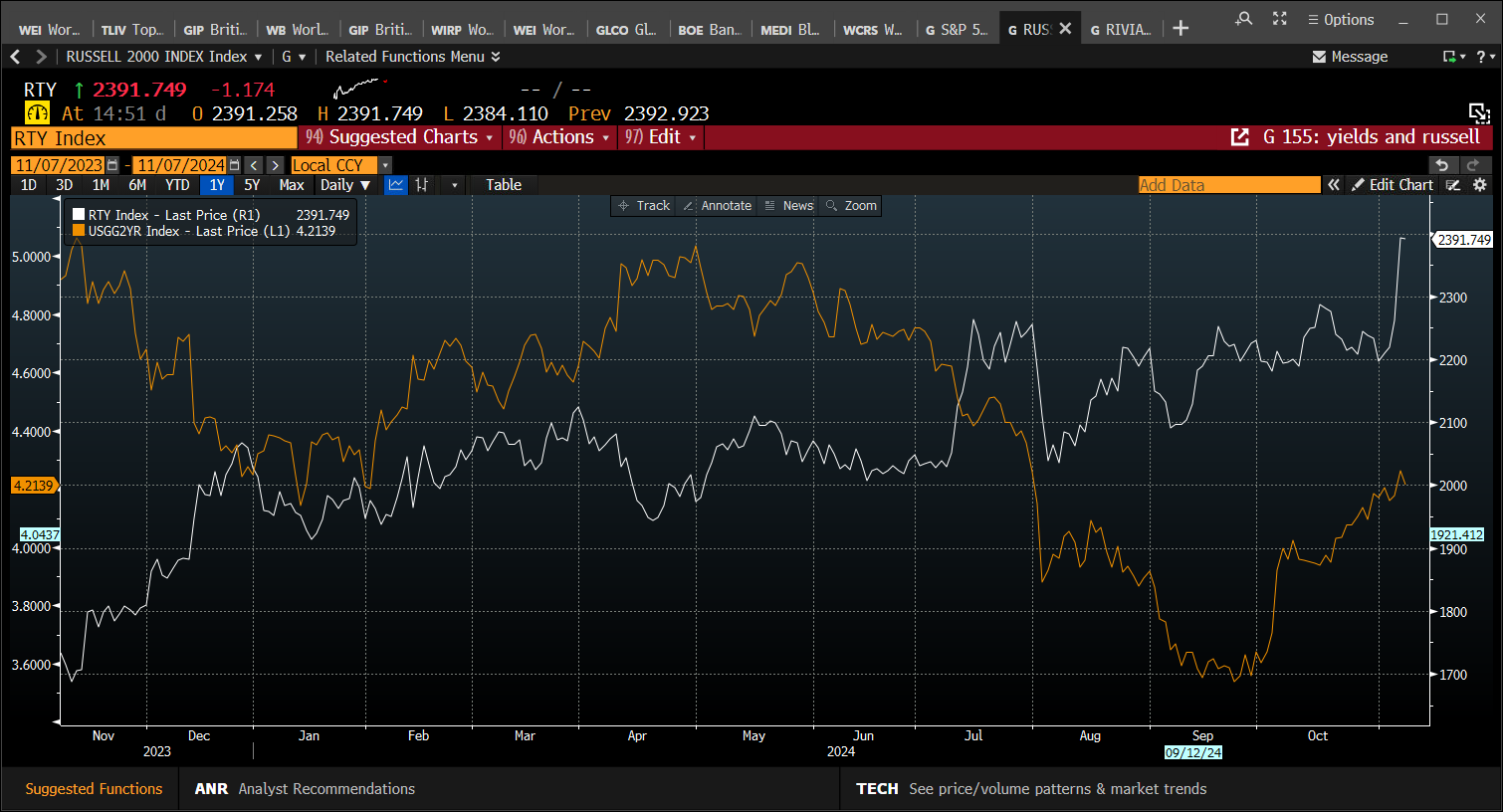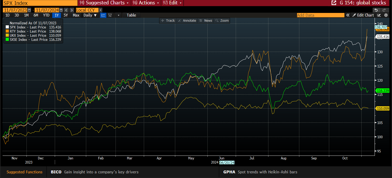 The win for Trump in the US is good for US stocks, with the S&P 500 and the mid cap Russell 2000 surging. This has only exacerbated the performance gap between US equity indices and European and UK stock markets, as you can see below. We expect this to continue, as Trump’s America First policy plays out in global stock markets.