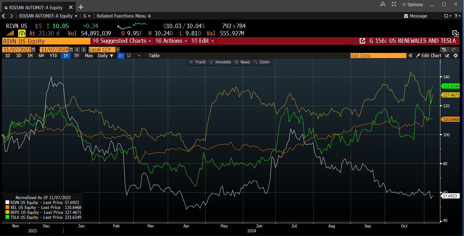 Rivian’s stock price has slumped in recent weeks, as the Trump trade has taken hold. Xcel Energy, one of the largest renewable energy producers in the US has also backed away from recent highs, and Pacific Oil and Gas, which is boosting its renewable production by 75%, has also fallen back on the back of Trump’s win. Thus, Tesla’s rally looks like an anomaly. Will it sell off because Trump is negative EVs? Or will Tesla and other domestic EV makers be able to garner the affection from Trump? If yes, then Rivian’s stock price could be ripe for a recovery.