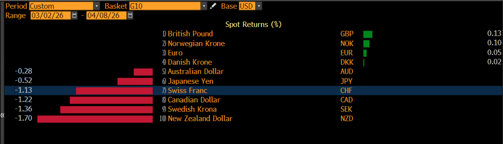 - The pound is now eking out a gain vs, the USD since the onset of the war, but there is still room for the Aussie, the kiwi, the yen and the Swiss franc to make up gains vs. the USD if this ceasefire holds.