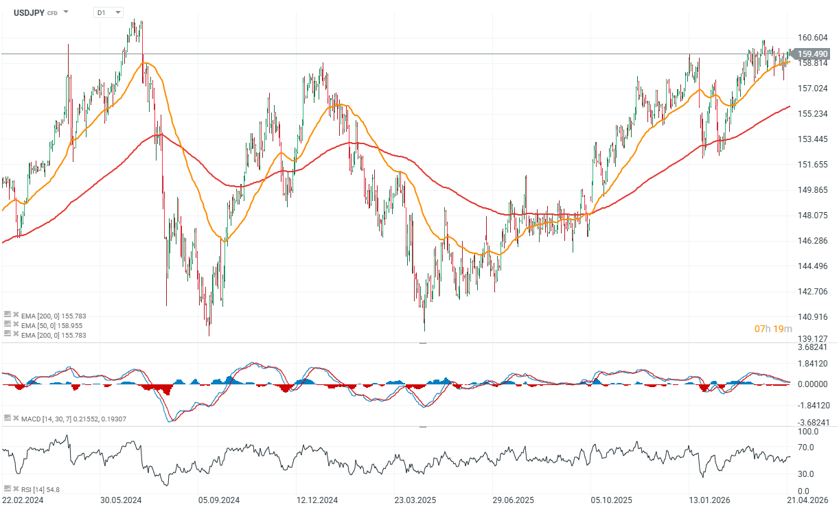 As a result, markets now expect rates to remain unchanged, similarly to the Fed decision scheduled for Wednesday, April 29. It is also worth noting that this will most likely be Jerome Powell’s final meeting as Chair of the Federal Reserve, although there is still a possibility that his potential successor, Kevin Warsh, may not be confirmed by Congress before May 15. USDJPY remains elevated, with the 160 level continuing to act as a strong resistance zone.