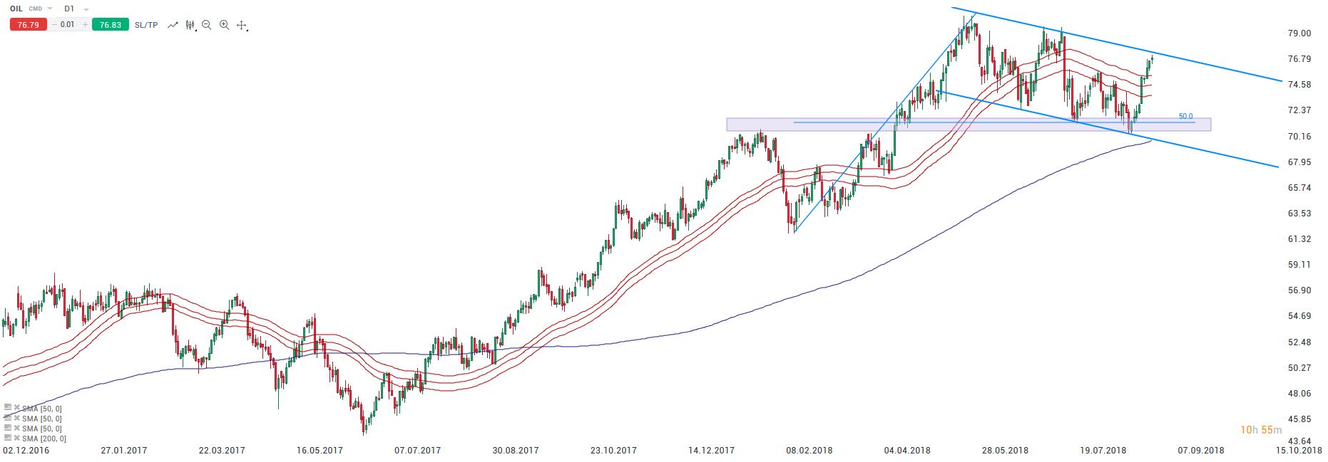Oil prices have seen a change of fortune lately, benefiting from an apparent decline in Iranian exports. Bear in mind that US sanctions on Iran will be restored on 4 November and buyers have until then to rearrange their supplies. Many of them has already done so and supply concerns have resurfaced along the way. While the oil rally lacks the momentum it had in the second half of 2017 or during the spring this year bulls managed to defend the key support zone just above the $70 mark for OIL. A rapid rebound of prices off that level confirms a shift from resistance to support. Bulls have now one more task – break through a descending upper limit of the correction channel.