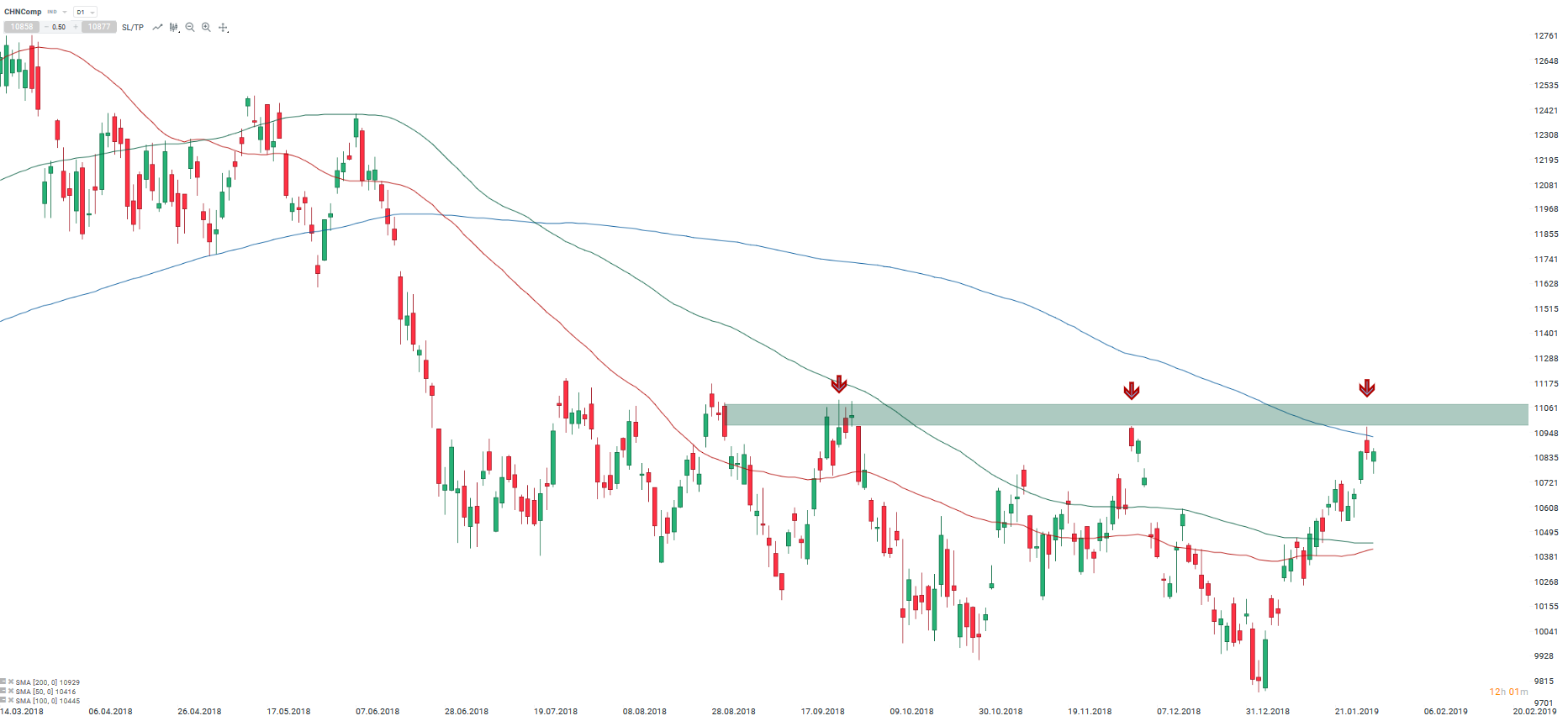 The first of three charts we consider interesting this week is HSCEI (CHNComp) - the Chinese stock market index. Negotiators from China and the United States will start a fresh round of trade talks in Washington tomorrow. What differs upcoming talks from the ones that were held earlier this month is the fact that now high-profile officials will meet. However, the latest turmoil surrounding Huawei may turn to be a hurdle towards making progress. A failure to move closer to resolving a deal may exert pressure on the global stock markets. CHNComp moved higher towards the supply zone in the vicinity of 11000 pts after an over 12% rally since the latest low. The aforementioned zone is additionally strengthened by the 200-session moving average therefore bulls may find it to be a hard nut to crack.