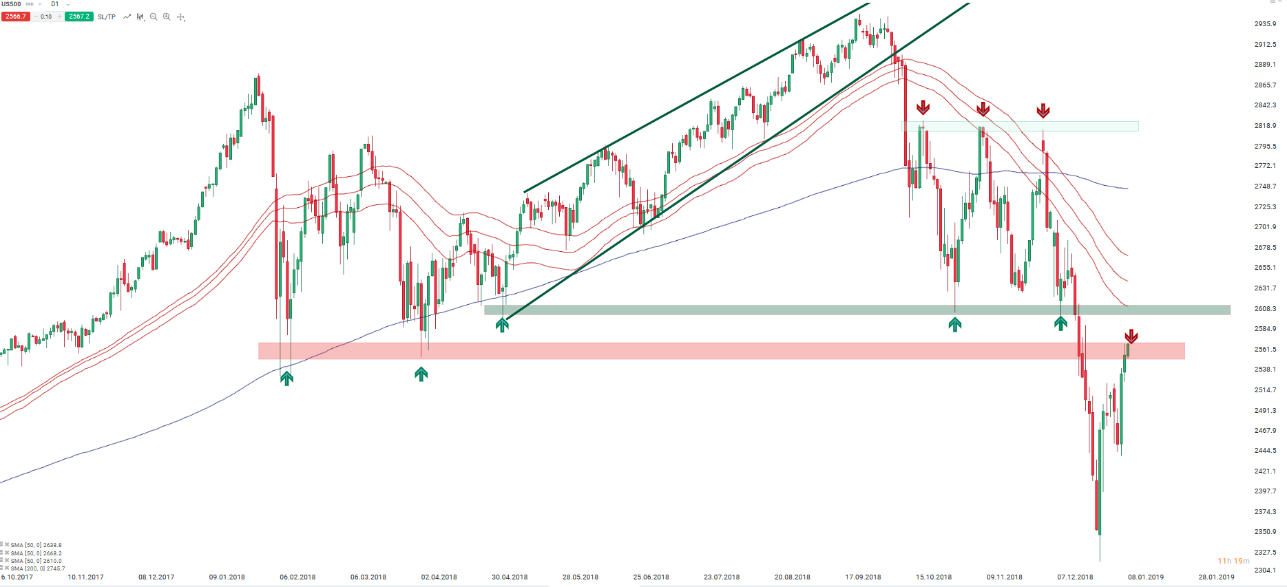 Christmas holiday has already came to an end and markets are back into full swing. Concerns over global economic slowdown in the quarters to come combined with mixed US data impacted stock markets severely. Nevertheless, Wall Street tried to recoup part of the losses in the past few days. In turn, the S&P 500 (US500) crawled back into 2550-2600 pts area that served as the support level previously. Is it just a minor correction in the downtrend or are we experiencing the beginning of a longer-lasting recovery? We shall know more next week as the major US companies will begin to publish their full-year earnings reports. Moreover, the resumption of the US-China trade talks is also a positive sign but the ultimate impact on the global economy will depend on whether World’s biggest economies can reach an agreement or not. From the technical point of view the aforementioned support zone should limit further gains. This is especially true as the US500 decline from the latest ATH exceeded 20% suggesting that the index dropped into bear market territory.