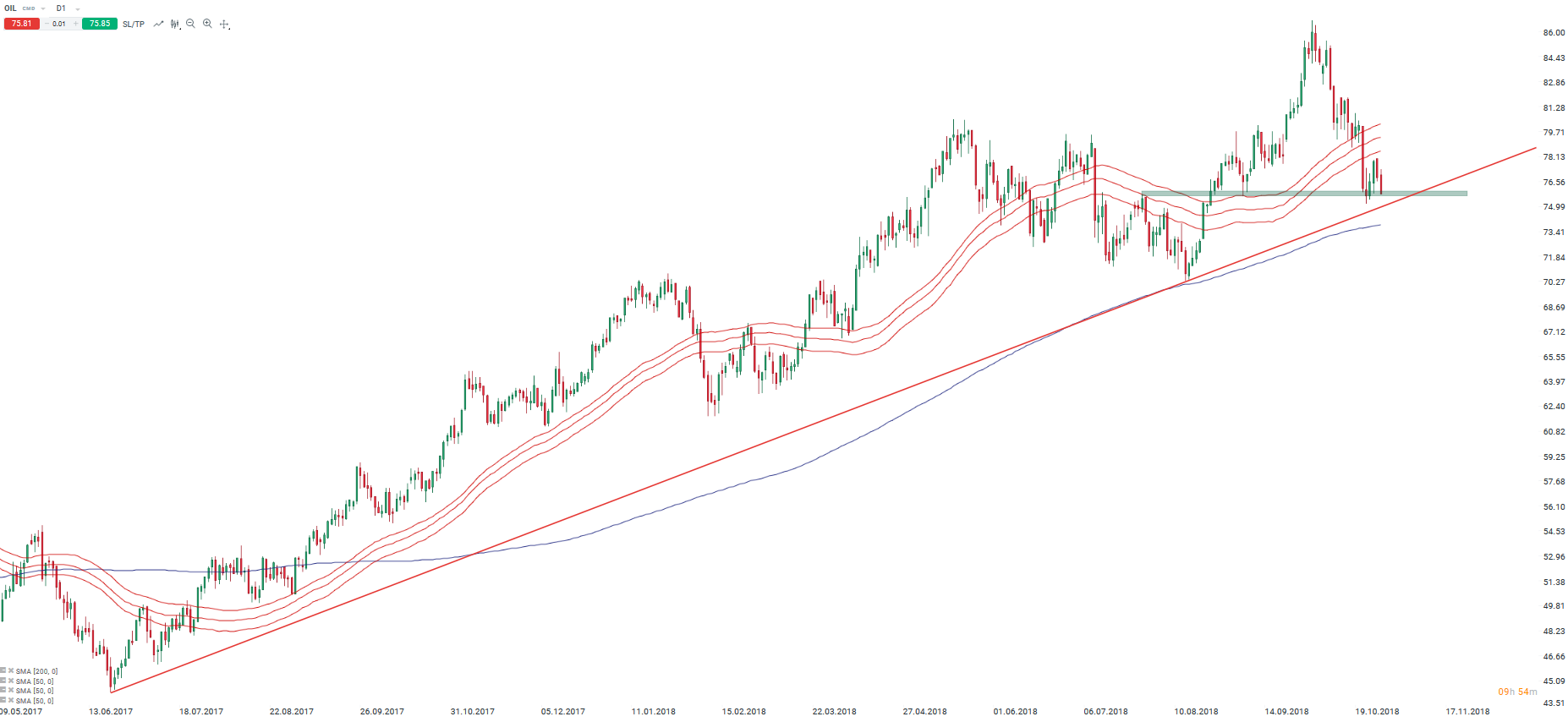The last market we will take a look at is OIL. The US sanctions on Iran will take full effect next week but their impact was in big part already priced in. However, given the latest declines on the oil market as well as rising inventories in the US (it can be ascribed to the maintenance season in the US refineries that is coming to an end) there is some space for recovery. Additionally, Brent (OIL) pulled back to the support level at $75.50 handle. A notch below this hurdle one can find the ascending trendline that may also serve as support. API weekly oil stocks data will be published this evening and it is expected to show another week of rising inventories.